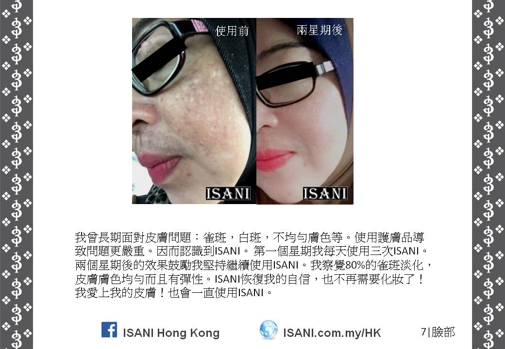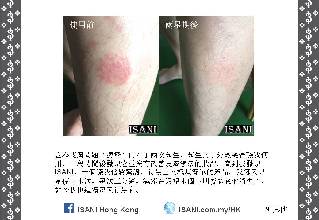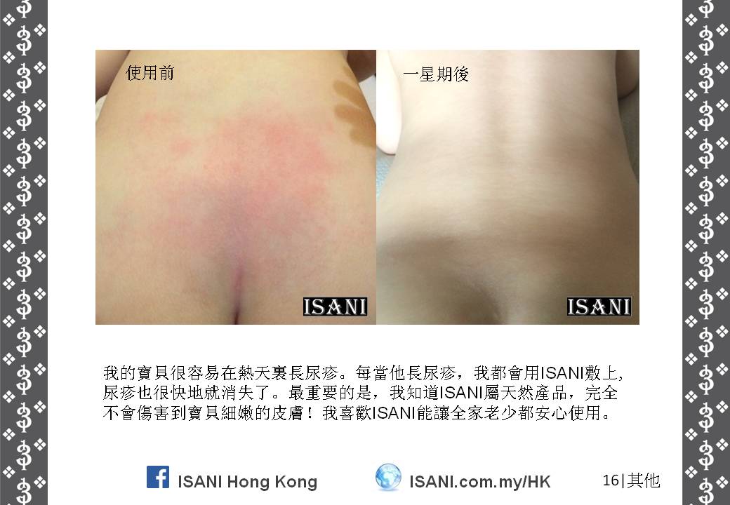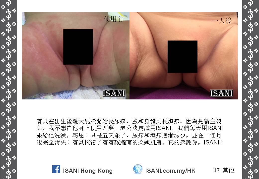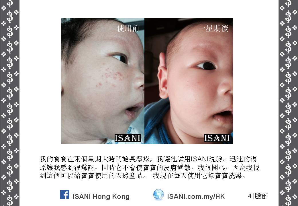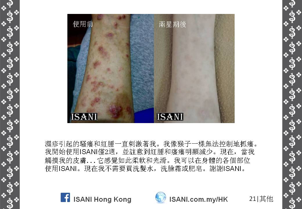 ISANI是以獨特的配方來取代皮膚和個人保養品。它適合所有皮膚性質和各年齡階層,也適於使用在臉部、頭髮、全身肌膚甚至皮膚炎,並且在一至三分鐘就可以觀察到它的效力。就是這麼簡單容易。