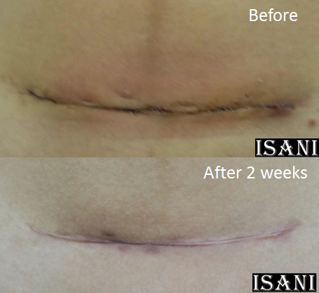 我在不久前剖腹生產,因此有了一條又長又難看的疤痕。在坐月子時通過面子書認識到ISANI,就買一盒來試試。沒想到只是短短兩個星期,疤痕就明顯地淡化了!太神奇了,我真的很滿意ISANI的效果。